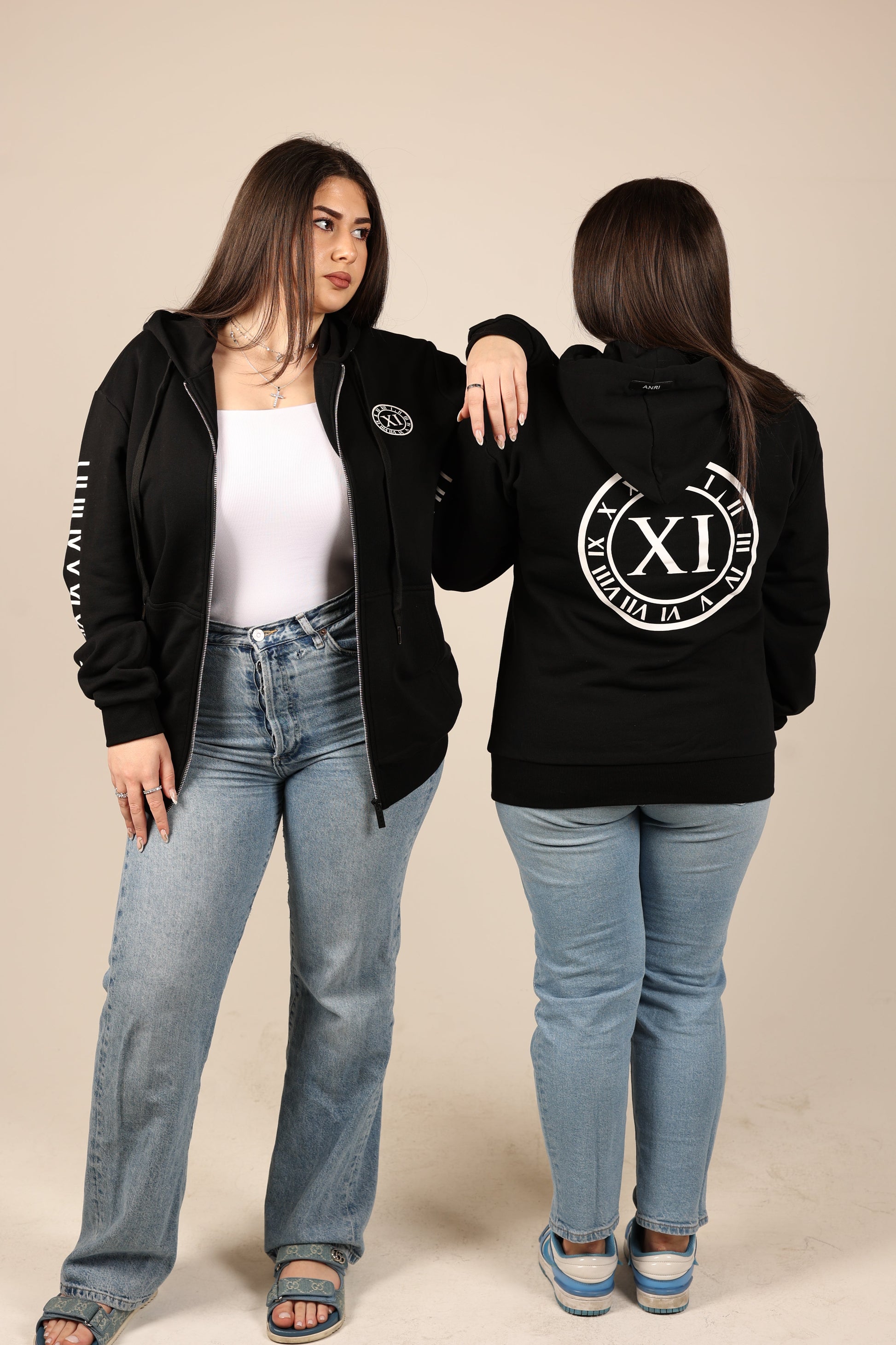 This zip-up hoodie features Roman numerals down both sleeves, a bold XI clock graphic on the back, and the ANRI crest on the front. With a relaxed unisex fit and soft cotton blend, it’s made for movement, comfort, and everyday wear. Finished with a front zipper, adjustable hood, and side pockets.
